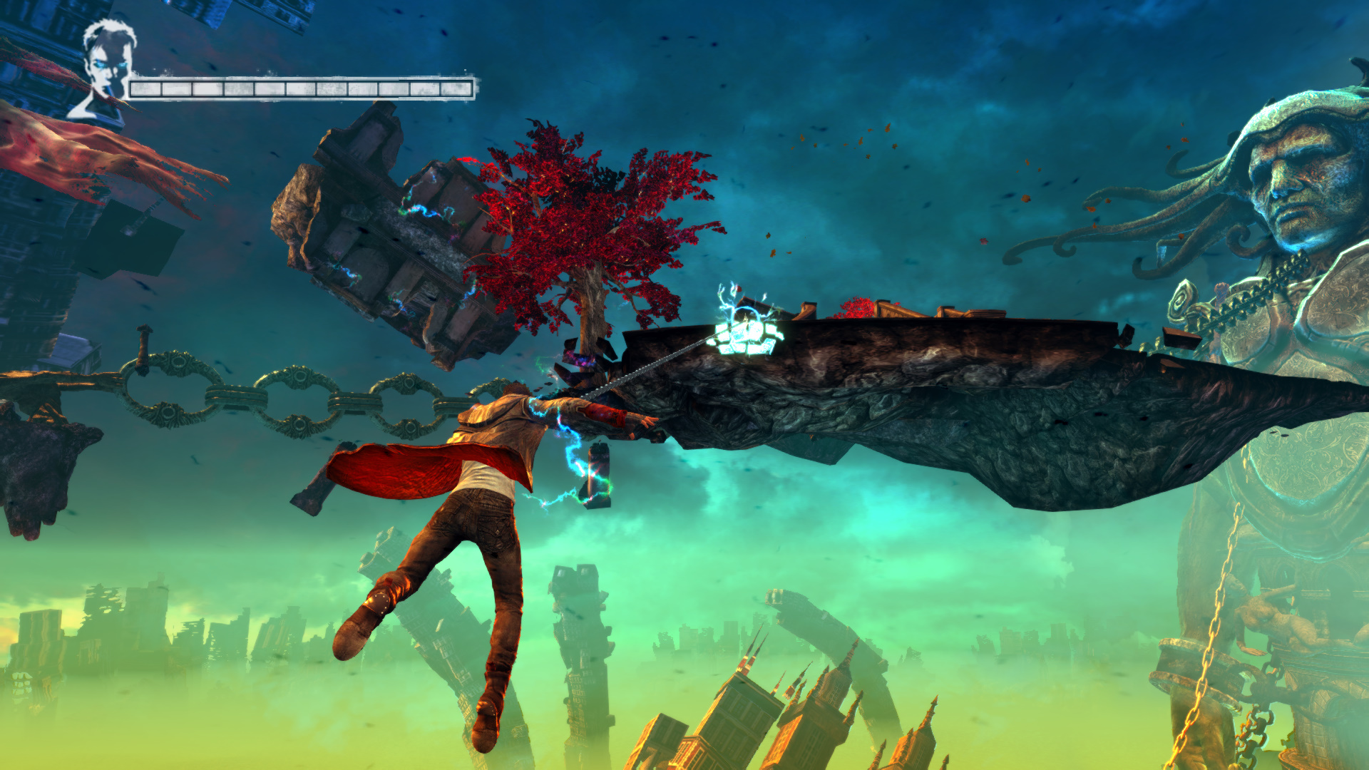 Ugyanolyan helyre jutottl ismt. A lncos szoborhoz. Ugyanaz a dolgod, mint az elzben. Ahogy elindulsz, rgtn az elsnl, ami egy lebeg flddarabhoz visz majd, amin egy vrs leveles fa ll, Ozirisz Ophion ostor alakjval tudsz tjutni, aminek segtsgvel ellenflbe vagy trgyba tudsz kapaszkodni, s odahzni magad. Magad eltt ltsz fentebb egy darabot, amin kk jelzs jelzi, azt el kell kapnod, s t tudod magad hzni gy, ahogy a kpernyn a segtsg mutatja. Fontos, hogy tartsd nyomva a gombot, klnben leesel. Prbld ki az ellenfeleiden is. Kombinlva is tovbb lehet jutni, az az egyszerre hasznlhat az angyali s a dmoni ostor, mindssze oda kell figyelned, mert ha elrontod, leesel. Amint a lncos szoborhoz jutottl, Arbiterrel sd szt.