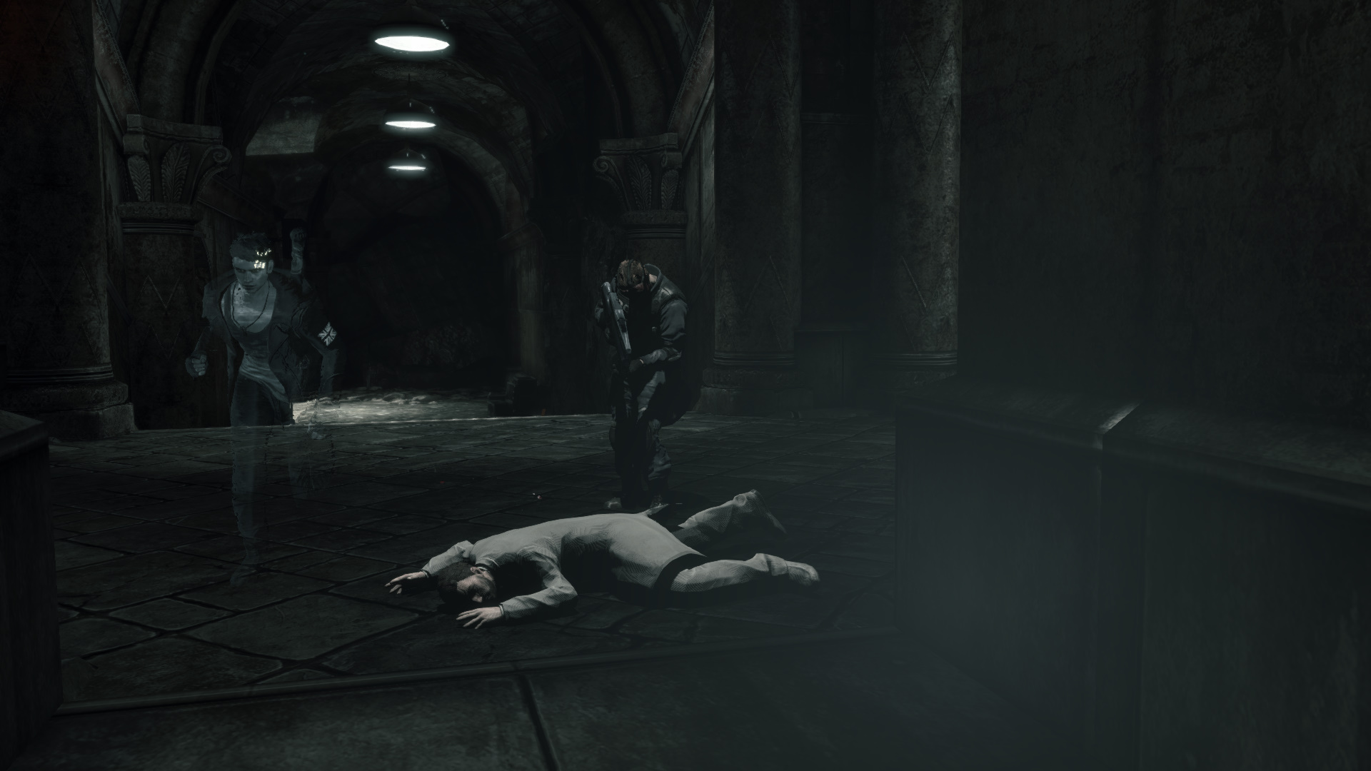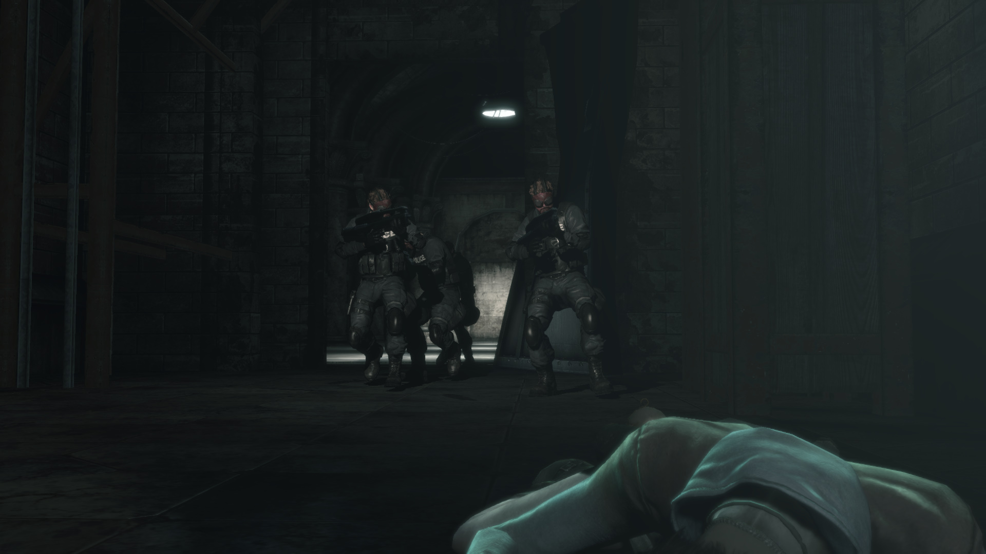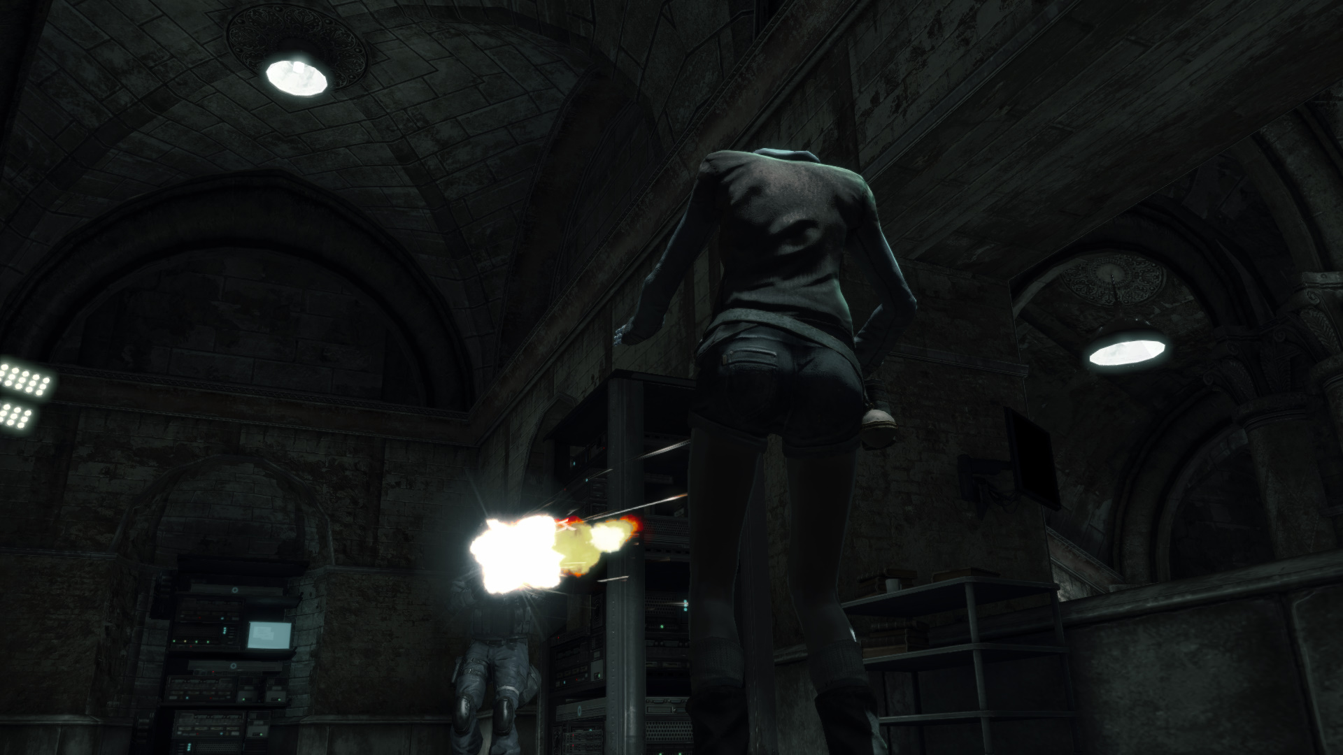 Kvesd fel a lpcsn, majd jobbra, t azon az ajtn, melyen a katonk utat trtek. Fel a hossz lpcsn, szembe Kat azonostatja magt az ajt kinyitshoz. Jobbra, ismt jobbra, majd balra egy folyosra, s fel a lpcsn. Katonkba botlotok, akik rtatlanokat lnek le.