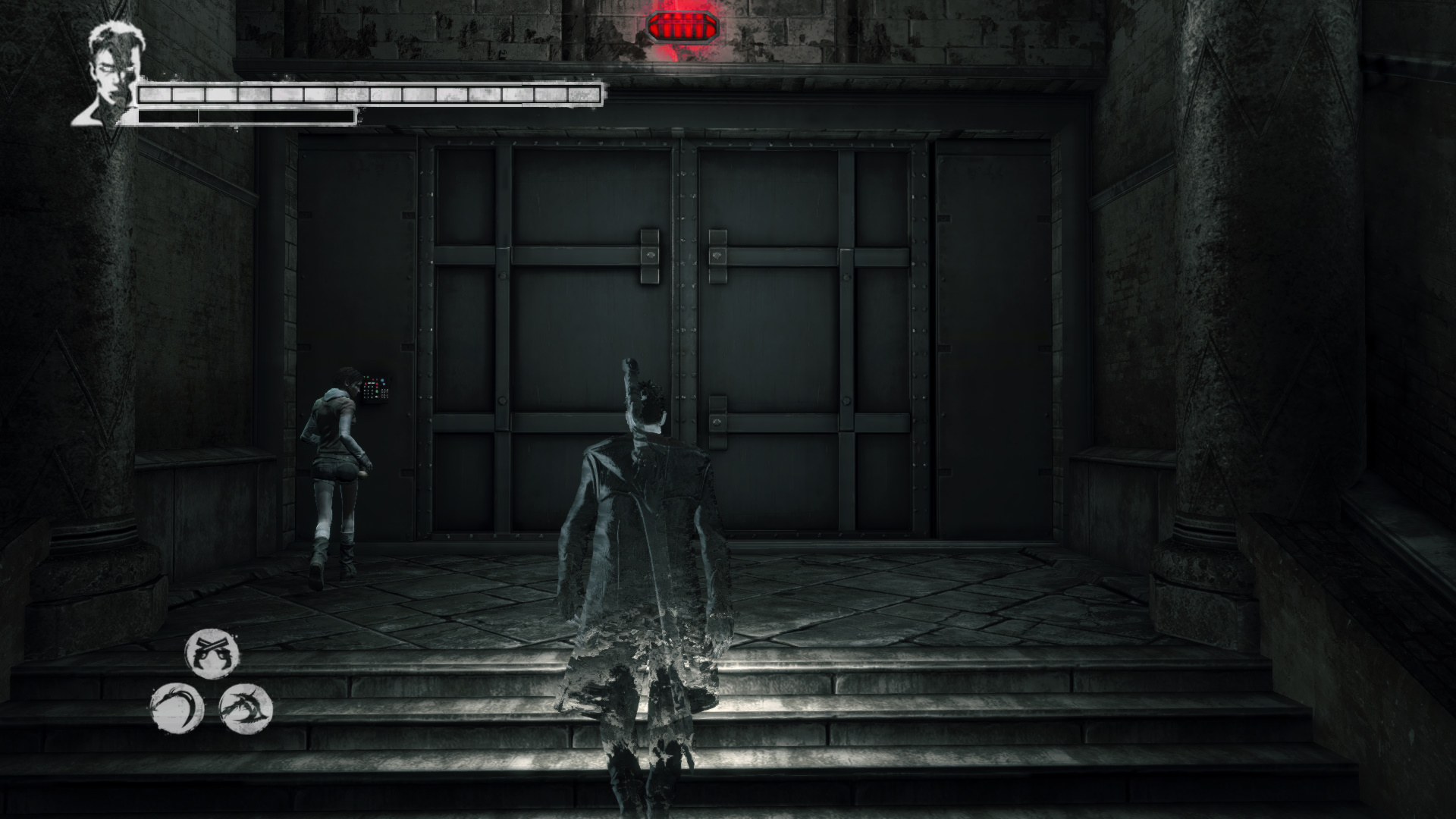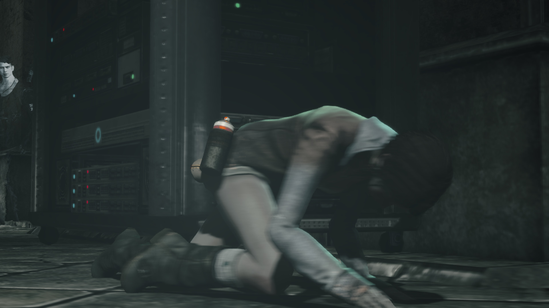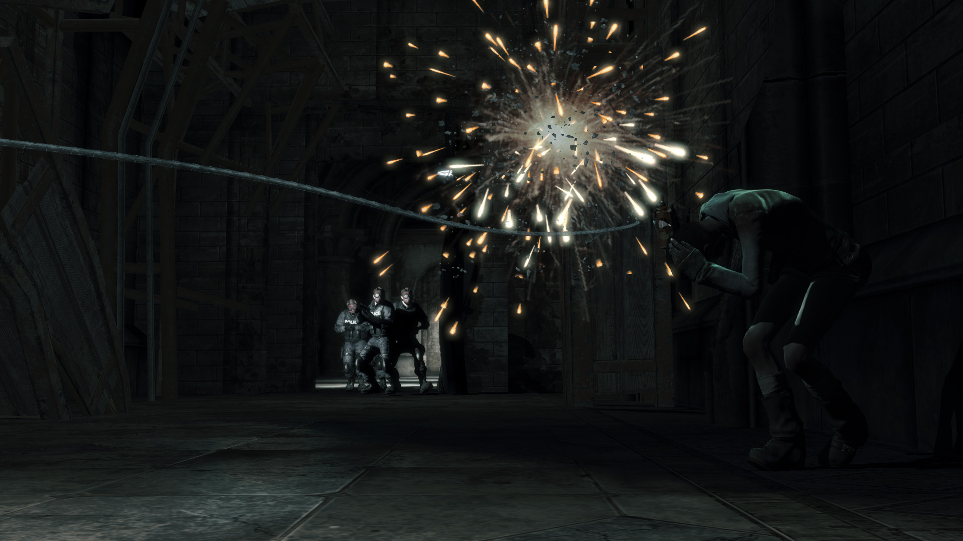 Elttetek a falra ismt graffitit fest, te pedig utat trsz. A fal mgtt egy ajt van. De ti balra a lpcsn felmentek egy msik ajthoz. Kat a belpnl azonostatja magt, hogy az kinyljon. Szembe egy repeds van a falon. Balra a folyos tl vgn a katonk berobbantottk a falat, utat trve maguknak. Ez baj, mert Katet meglthatjk.