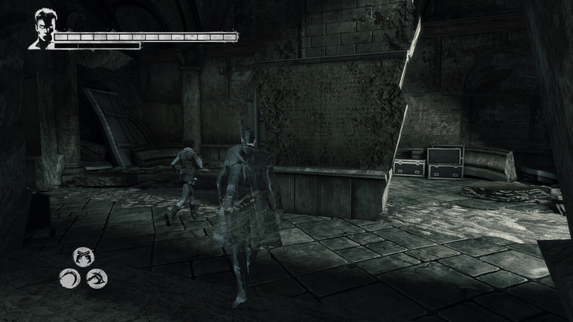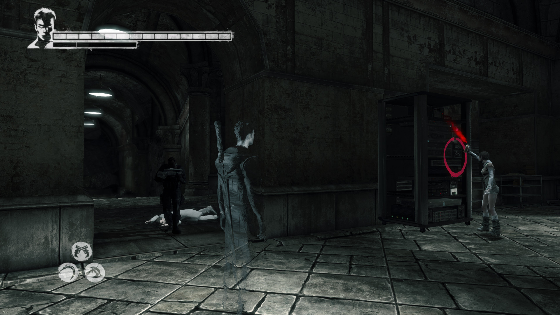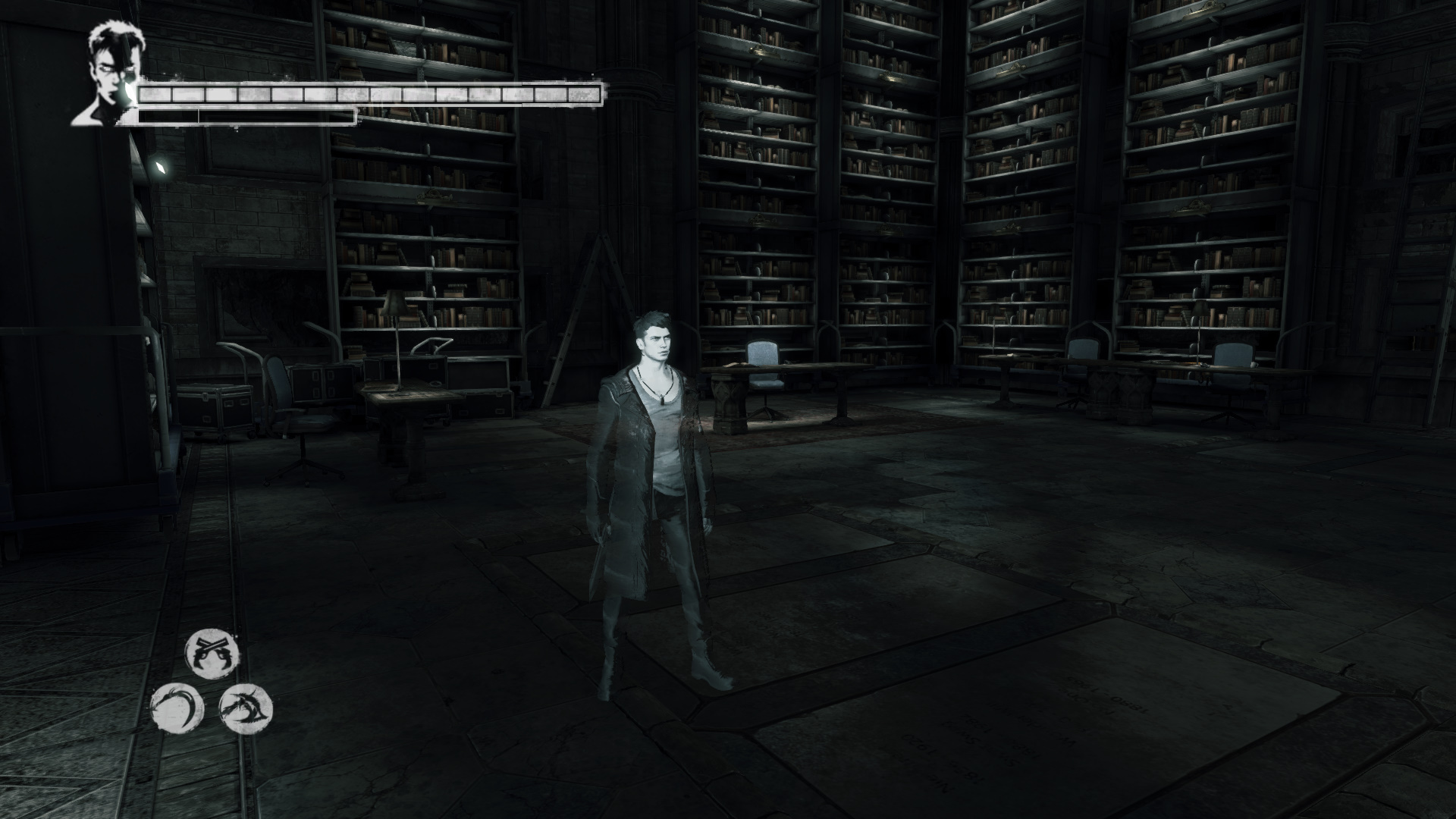 Kat jabb ajtt nyit ki. Le a lpcskn, mg nem oldalt kt irattart szekrnyekkel teli folyosra juttok. Az jabb ajt kinyitsa utn egy terembe juttok - pontosabban oda, ahol Vergillel elszr tallkoztl. Az mgtt egy hatalmas knyves polc egy rsze, mint egy titkos hely, ajtnak nyitva. Az mgtt egy nyitott, koporsszer lda. Mg tovbb pedig egy nagyobb hely, szembe egy szmtgpes rendszer. Ott pedig Vergil. A bejrattl balra Zld Gub.